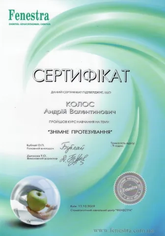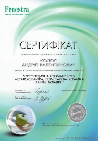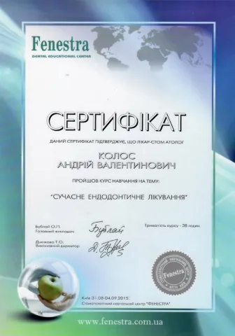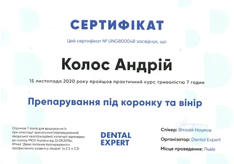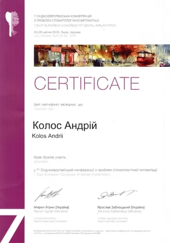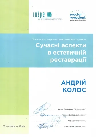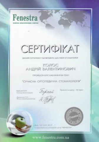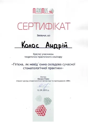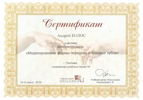 - 2014 – 2016рр. - інтернатура на базі Центру стоматологічної імплантації та протезування «ММ».